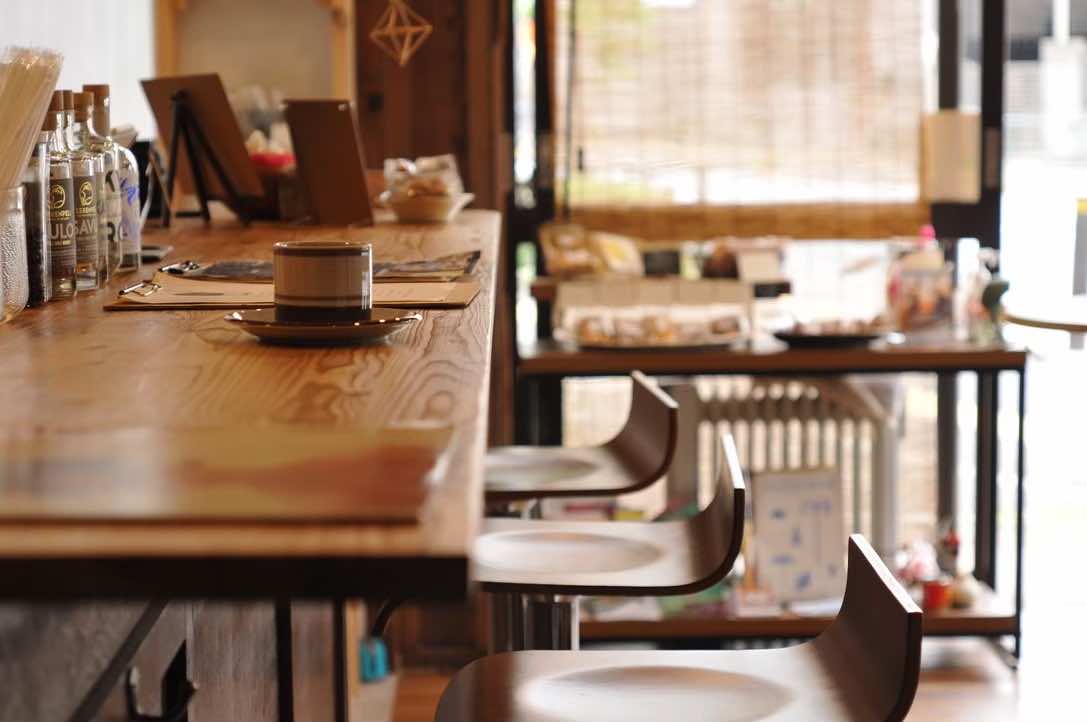 カウンター6席、ベンチ3席、窓際カウンター3席、テーブル4席の計16席があるカフェ&バー。